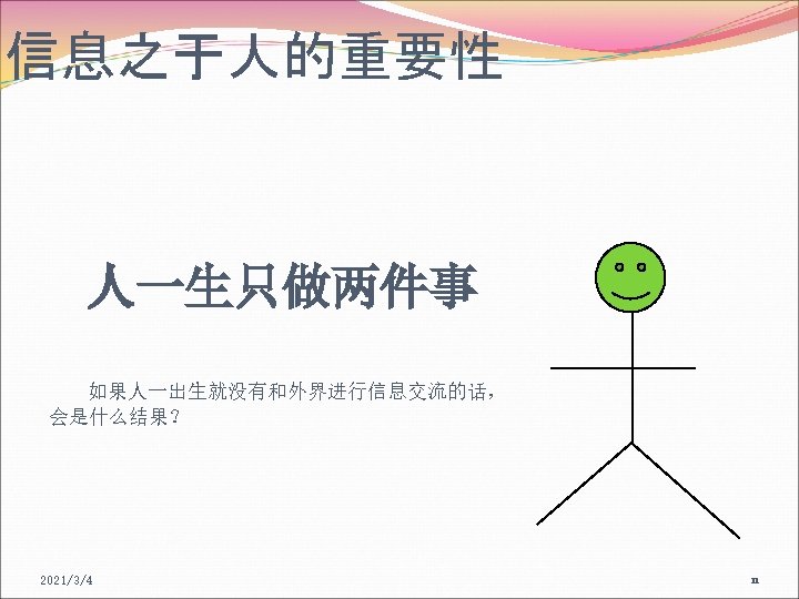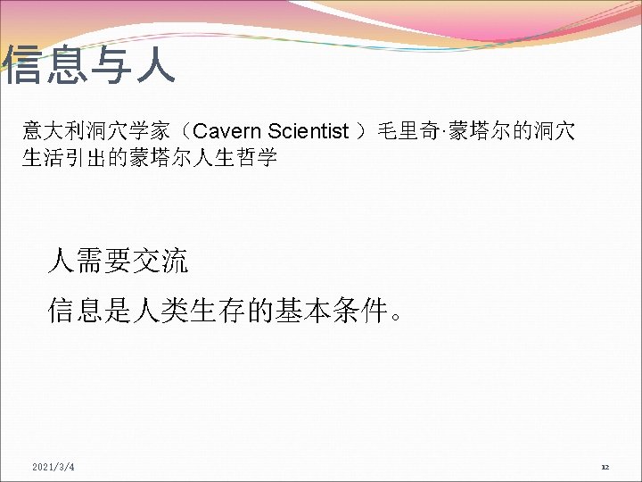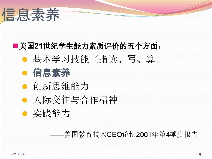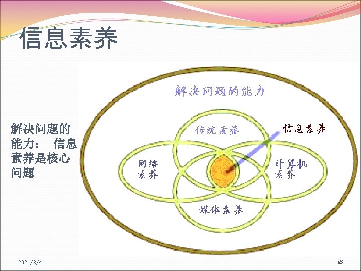 信息素养的概念 信息素养的重要意义(名人名言) I have a simple but strong belief that how you gather, manage and use information will determine whether you will win or lose. ----Bill Gates 2021/3/4 19