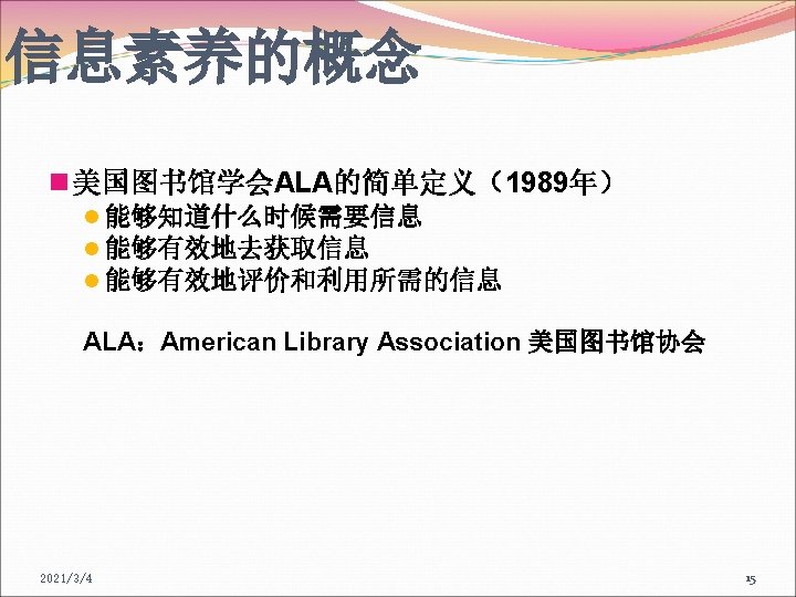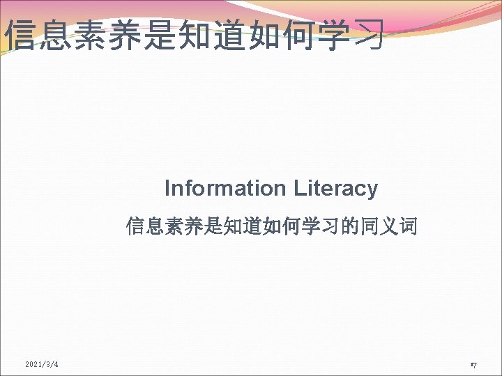 信息素养的概念 To be information literate, a person must be able to recognize when information is needed and have the ability to locate, evaluate, and use effectively the needed information. 具有信息素养的人能够知道什么时候需要信息,能够 有效地获取、评价和利用所需要的信息。 ——美国图书馆协会ALA, 1989 2021/3/4 16