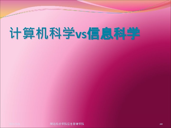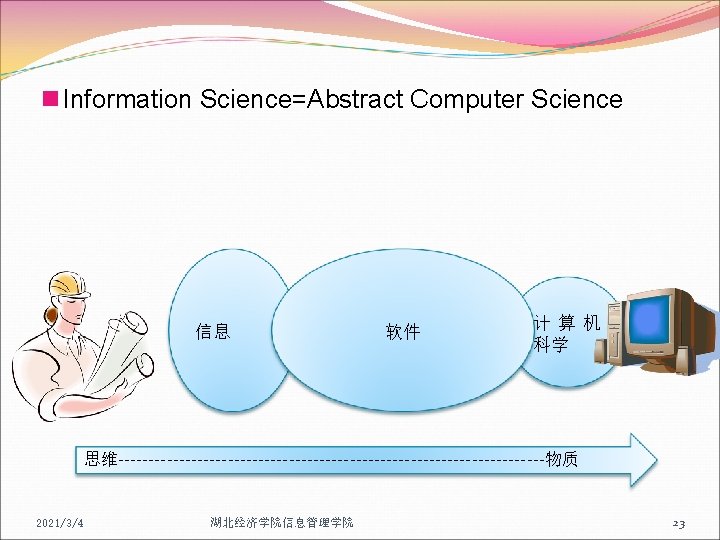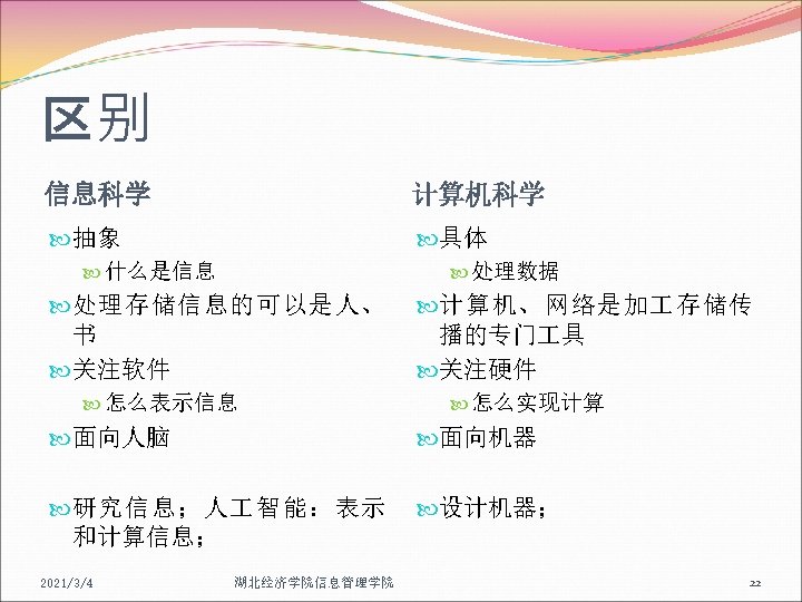 Info Sci. vs Computer Sci n Software, Hardware n Human Logic, Machine Mechanism n Info Sci, deals with info, regardless of whether computers are used l Cryptology before computer was invented 2021/3/4 湖北经济学院信息管理学院 32