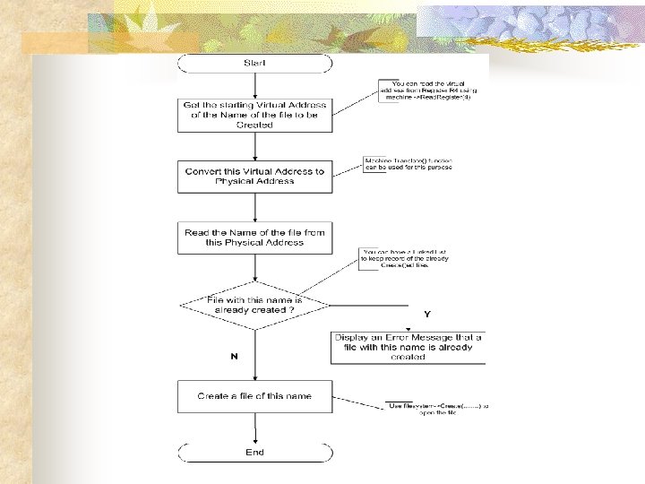 Implementation example: n n Add your code in exception. cc. Read. Register -> machine. cc n n To get the starting virtual address. Read. Mem -> translate. cc n Translate virtual address to real address
