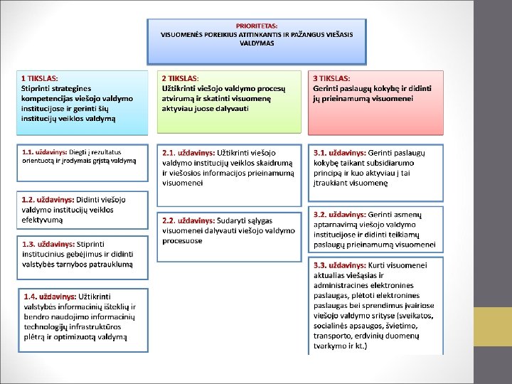 Viešojo valdymo tobulinimo kryptys: VISUOMENĖS ĮTRAUKIMAS IR ATVIRUMAS Atveriant valdžios turimą informaciją visuomenei ir jai suteikiant įgalinimus dalyvauti viešojo valdymo procesuose: . . PASLAUGŲ KOKYBĖ Paslaugų teikimą orientuojant į vartotoją, siekiant aukštesnio paslaugų kokybės lygio ir didesnio prieinamumo: . . § § § § Valstybės turimos informacijos viešinimas Viešųjų konsultacijų vykdymas Įtraukimas / įgalinimas Bendruomenės narių gebėjimų stiprinimas Seniūno veiklos efektyvumo didinimas Bendruomenių savivaldos stiprinimas § § § Paslaugų kokybės standartų sukūrimas Paslaugų inventorizacija / optimizavimas Piliečių chartijos Paslaugų kokybės vertinimas Vienodų sąlygos paslaugų teikėjams sudarymas Vieno langelio principo taikymas E-paslaugų kūrimas ir diegimas VALDYMO EFEKTYVUMAS Stiprinant strateginį mąstymą, gerinant institucijų veiklos valdymą, stiprinant valstybės tarnybą: . . . § Įrodymais grįstos informacijos panaudojimas § Veiklos kokybės vertinimas § Projektinis / procesinis valdymas § Teisės aktų kokybės didinimas § Administracinės naštos mažinimas § Tarpinstitucinio bendradarbiavimo stiprinimas § Institucinės sandaros tobulinimas § Funkcijų optimizavimas § Išteklių valdymo efektyvumo didinimas § Valstybės tarnybos patrauklumo didinimas