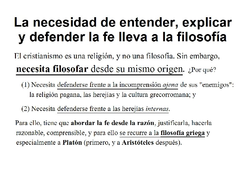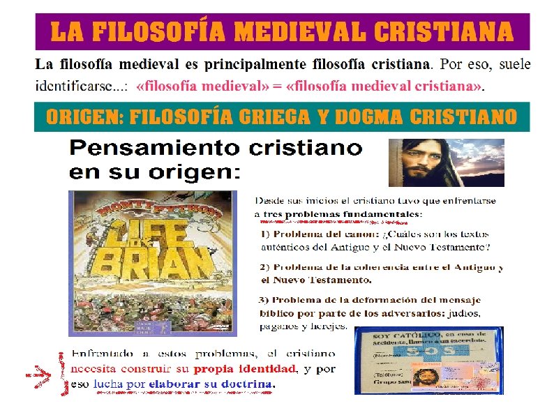 LA FILOSOFÍA MEDIEVAL La filosofía medieval es la filosofía que tuvo lugar durante la Edad Media. Un rasgo fundamental de la filosofía medieval es que se desarrolla en un marco religioso muy fuerte, al servicio de objetivos teológicos. «Philosophia ancilla theologiae» -la filosofía es sierva de la teología- N. B. La filosofía deja de ser considerada “saber supremo”!! La filosofía medieval incluye tres filosofías distintas, según el marco religioso en el que se desarrollan: 1. Filosofía cristiana. ← ¡La principal! 2. Filosofía árabe. 3. Filosofía judía.