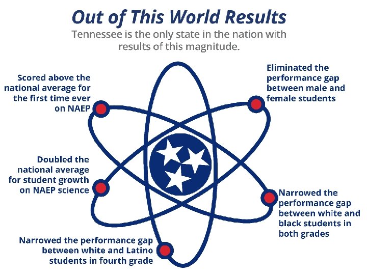 This call to action sparked a series of action in Tennessee. • Implementation of more demanding standards for students. • Development of more rigorous assessments with higher, more honest cut scores. – When Tennessee increased cut scores on its new assessment in 2010, proficiency rates dropped by more than half and achievement gaps more than doubled. – In 2016, a new, more rigorous assessment rolled out with new cuts that were based on achievement level descriptors closely matched to those used by NAEP. • Greater accountability to ensure that we meet our responsibilities to provide all students with a world-class education.