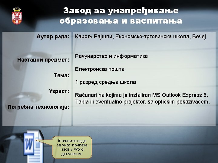 Osnovna struktura e-mail Adrese: Korisničko_ime@provajder. oznaka • korisničko ime bira svaki korisnik za sebe. Svako korisničko ime mora da bude različito unutar jednog provajdera. • Provajder je organizacija koja pruža pravo korišćenja internet servisa (među njima i pravo na korišćenje email-a). • oznaka naglašava tip organizacije koja pruža usluge, ili iz koje zemlje potiče provajder. Primeri oznaka: . yu, . com (za komercialne firme), . hu, . . . Primer e-mail adrese: dex_the_anoying@yahoo. com
