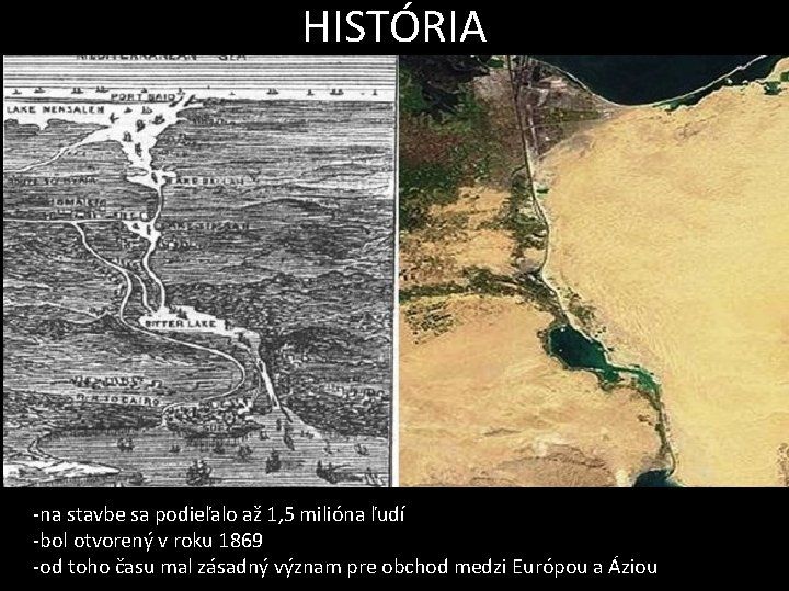 HISTÓRIA -na stavbe sa podieľalo až 1, 5 milióna ľudí -bol otvorený v roku 1869 -od toho času mal zásadný význam pre obchod medzi Európou a Áziou