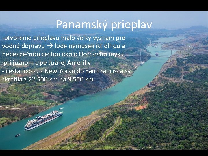 Panamský prieplav • otvorenie prieplavu malo veľký význam pre vodnú dopravu lode nemuseli ísť dlhou a nebezpečnou cestou -otvorenie prieplavu malo veľký význam pre okolo Hornovho mysu pri južnom cípe Južnej Ameriky vodnú dopravu lode nemuseli ísť dlhou a • napríklad cesta loďou z New Yorku do San Francisca sa skrátila nebezpečnou cestou okolo Hornovho mysu z 22 500 km na 9 500 km pri južnom cípe Južnej Ameriky - cesta loďou z New Yorku do San Francisca sa skrátila z 22 500 km na 9 500 km
