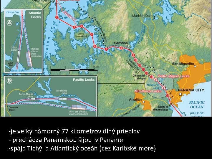 -je veľký námorný 77 kilometrov dlhý prieplav - prechádza Panamskou šijou v Paname -spája Tichý a Atlantický oceán (cez Karibské more)