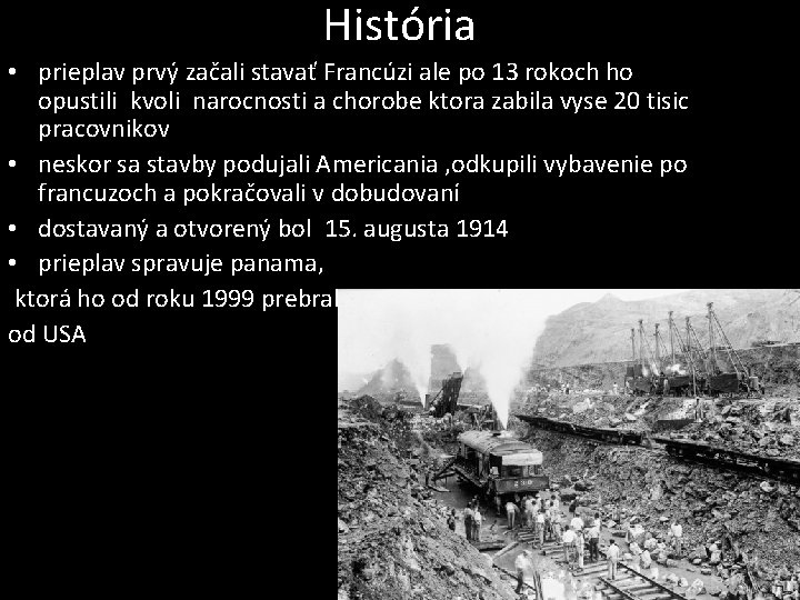 História • prieplav prvý začali stavať Francúzi ale po 13 rokoch ho opustili kvoli narocnosti a chorobe ktora zabila vyse 20 tisic pracovnikov • neskor sa stavby podujali Americania , odkupili vybavenie po francuzoch a pokračovali v dobudovaní • dostavaný a otvorený bol 15. augusta 1914 • prieplav spravuje panama, ktorá ho od roku 1999 prebrala od USA