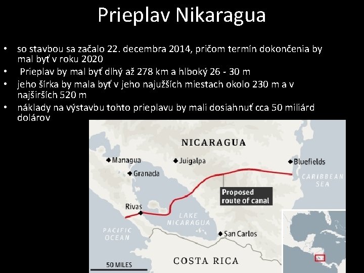 Prieplav Nikaragua • so stavbou sa začalo 22. decembra 2014, pričom termín dokončenia by mal byť v roku 2020 • Prieplav by mal byť dlhý až 278 km a hlboký 26 - 30 m • jeho šírka by mala byť v jeho najužších miestach okolo 230 m a v najširších 520 m • náklady na výstavbu tohto prieplavu by mali dosiahnuť cca 50 miliárd dolárov