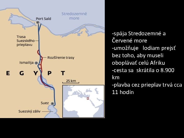 -spája Stredozemné a Červené more -umožňuje lodiam prejsť bez toho, aby museli oboplávať celú Afriku -cesta sa skrátila o 8. 900 km -plavba cez prieplav trvá cca 11 hodín