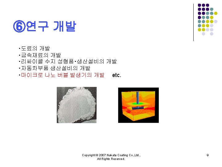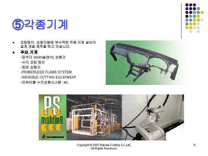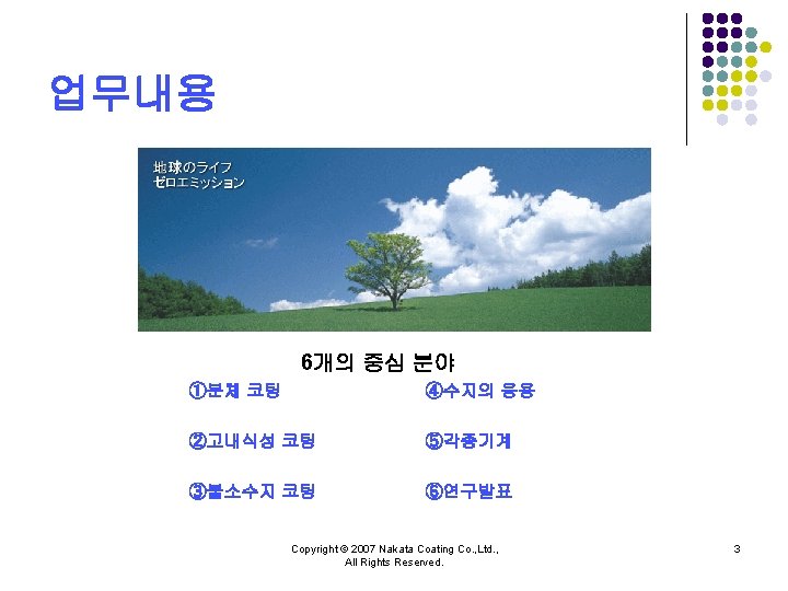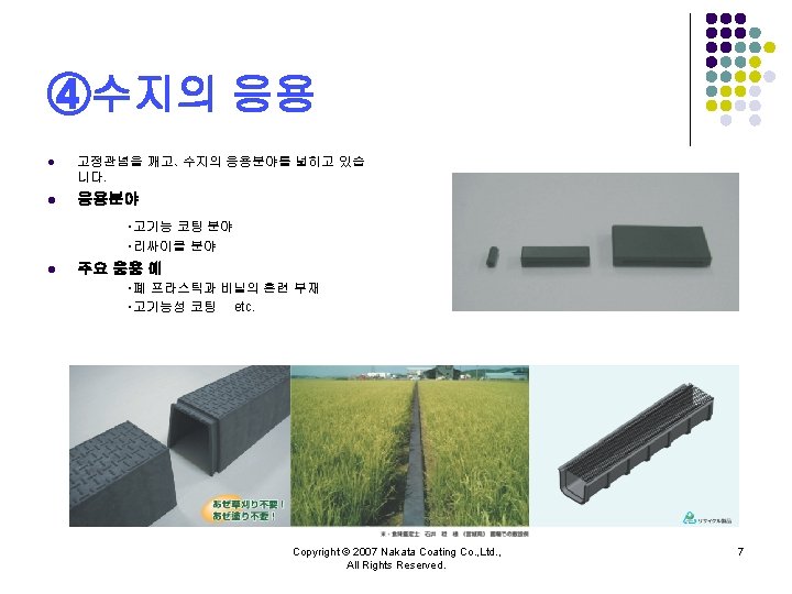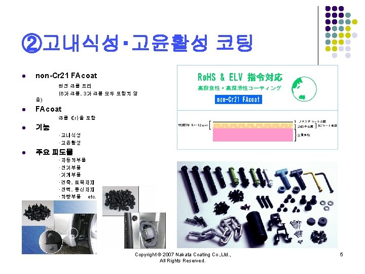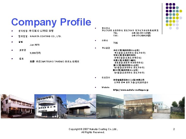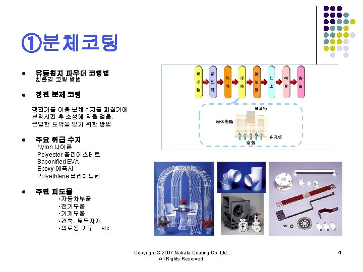 NAKATA COATING CO LTD Copyright 2007 Nakata Coating Slides: 10 Download presentation 주식회사 나카타 코팅 NAKATA COATING CO. , LTD. 회사소개 Copyright © 2007 Nakata Coating Co. , Ltd. , All Rights Reserved. 1 ③불소수지 코팅 l 내약품 성능, 윤활성능을 필요로 하는 것에 불소수지 코팅을 실시하고 있습니다. l 기능 ・비점착성 ・내열성、저온특성 ・윤활성 ・비유성(非濡性) ・내마모성 ・전기특성 ・내약품성・내식성 l 수지 PTFE(Poly Tetra Fluoro Ethylene) FEP(Fluorinated Ethylene Propylene copolymer) PFA(tetra fluoro ethylene-Per. Fluoro Alkylvinyl ether copolymer) Modified fluorine resin(One-coat enamel) ETFE(Ethylene Tetra Fluoro Ethylene) l 주요 피도물 ・내열、내약품성、탱크、배관부품 ・약품조 ・식품가공설비부재 etc. Copyright © 2007 Nakata Coating Co. , Ltd. , All Rights Reserved. 6 주식회사 나카타 코딩 NAKATA COATING CO. , LTD. Copyright © 2007 Nakata Coating Co. , Ltd. , All Rights Reserved. 10