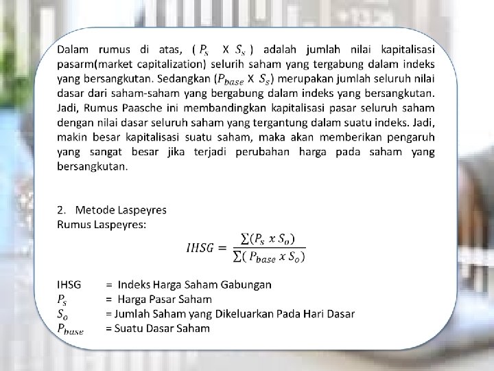 Metode rata-rata (Average Method) PERHITUNGAN INDEKS HARGA SAHAM GABUNGAN Metode rata-rata tertimbang (Weighted Average Method)