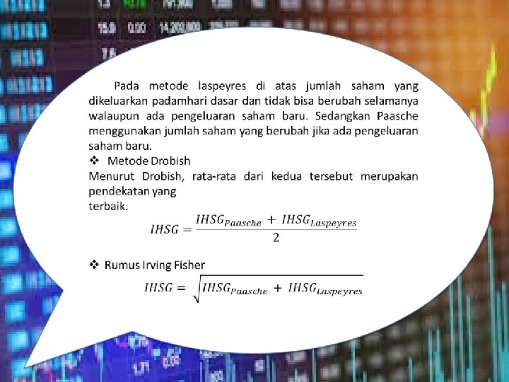 Bentuk penyajian indeks harga saham berdasarkan satuan angka dasar yang telah disepakati. Metodologi pencatatan dan penyajian informasi berdasarkan angka indeks tersebut dapat dikembangkan dengan berbagai variasi, sesuai dengan tujuannya masing-masing. Dalam kerangka itulah dikenal indeks harga saham sejenis, indeks harga saham individual, indeks harga saham gabungan dan lain-lainnya. Berbagai penyajian informasi indeks tersebut bersifat spesifik agar investor dapat memanfaatkannya dalam strategi investasi di bursa saham.