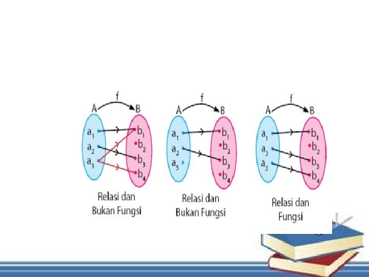 q. Pada gambar 1, 3 dan 4 setiap anggota himpunan A mempunyai pasangan tepat satu anggota himpunan B. Relasi yang memiliki ciri seperti itu disebut fungsi atau pemetaan. q. Pada gambar 2 bukan fungsi karena ada anggota A yang punya pasangan lebih dari satu anggota B.