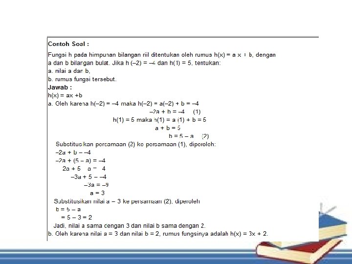 contoh q Diketahui : 1. { (-1, 2), (-4, 51), (1, 2), (8, -51) } 2. { (13, 14), (13, 5) , (16, 7), (18, 13) } 3. { (3, 90), (4, 54), (6, 71), (8, 90) } 4. { (3, 4), (4, 5), (6, 7), (8, 9) } 5. { (3, 4), (4, 5), (6, 7), (3, 9) } 6. { (-3, 4), (4, -5), (0, 0), (8, 9) } 7. { (8, 11), (34, 5), (6, 17), (8, 19) } q Ditanya : Carilah yang merupakan fungsi q Jawab : 1, 3, 4, 6