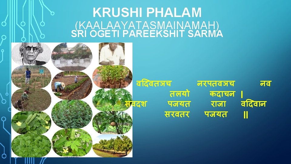 HIGHLIGHTS OF THE LESSON KRUSHI PHALAM • Sravana’s life in pune: 1. Sravana enjoying leisure along with his wife in Pune. 2. Srana felt that one should live for hundred years in this world only by doing some work and eager to start paurohitya classes. On a display plate he wrate …atra paurohityam samskrutamchadhyapyante. His monthly income was only 2000 rs • Sravana’s vegetable growing: He planted variety of plants(vegetables, fruit plants etc) • Importance of cultivation: krushikarmam janmasiddlham sarvesham bhutalavaasinaam • Sravana’s cultivation: He heard and learned cultivation from his father