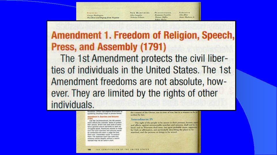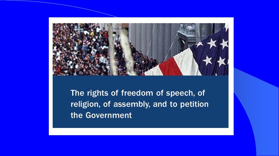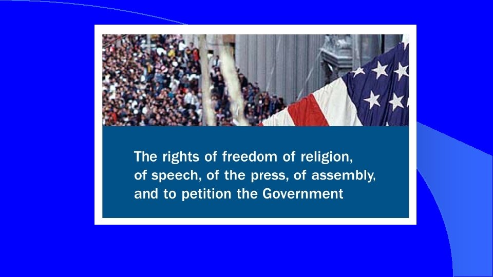 The First Amendment “Congress shall make no law respecting an establishment of religion, or prohibiting the free exercise thereof; or abridging the freedom of speech, or of the press; or the right of the people peaceably to assemble, and to petition the Government for a redress of grievances. ”