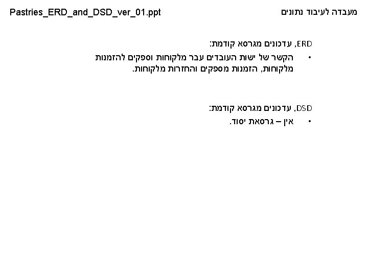 Nana_ER_and _DSD_Ver_01. ppt Pastries_ERD_and_DSD_ver_01. ppt מעבדה לעיבוד נתונים bakery goods marketing. Entity Relationships Diagram Suppliers B Supplier_ID_(PK) Products Supply Supplier_ID_(PK) Orders from suppliers D B Costumer_ID (PK) Orders from Costumers Order_ID (PK) D Returns from Costumers Deliver Order_ID (PK) Manages Employees B Costumers Order B Employee_ID (PK) D Legend Entity Basic Entity Dependant Entity Primary Key Foreign Primary Key Relation Deliver 1: 1 1: N N: M Self Relationship Mandatory Optional Entity prime_key(PK) B D PK FPK Relation