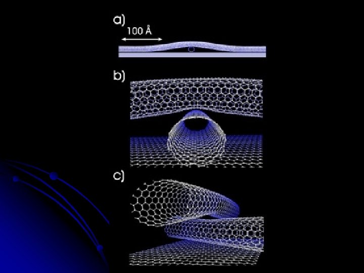 Carbon Nanotubes l What are they? l Carbon molecules aligned in cylinder formation l Who discovered them? l Researchers l at NEC in 1991 What are some of their uses? l Minuscule wires l Extremely small devices