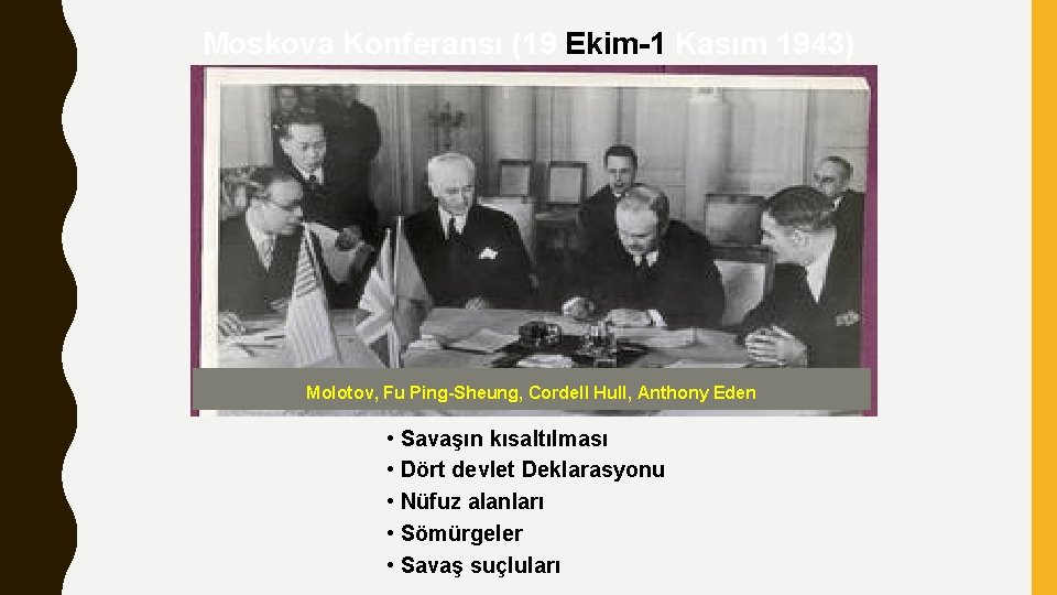 Moskova Konferansı (19 Ekim-1 Kasım 1943) Molotov, Fu Ping-Sheung, Cordell Hull, Anthony Eden • Savaşın kısaltılması • Dört devlet Deklarasyonu • Nüfuz alanları • Sömürgeler • Savaş suçluları