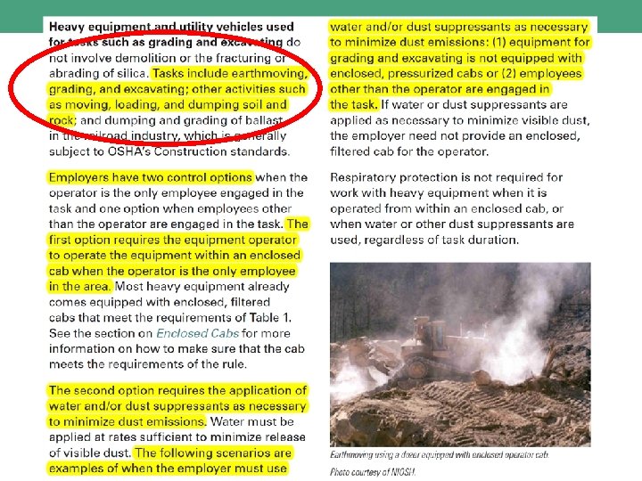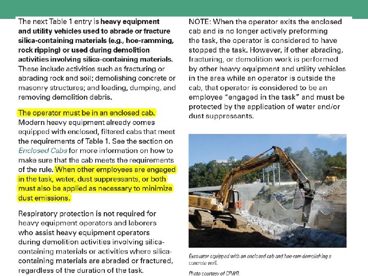 Brooming & sweeping controls Ø Not as straight-forward Ø Table 1: heavy equipment and utility vehicles that …. . ü abrade or fracture silicacontaining material … ü do NOT abrade or fracture Ø If abrading: enclosed cab + water suppression (if grounds-crew present) Ø If not abrading: water suppression *OR* enclosed cab when operator is only one engaged in activity https: //www. youtube. com/watch? v=SY 49 tv. WC 5 M