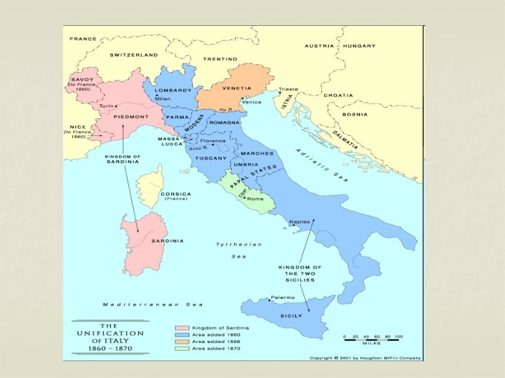The Unification of Italy n n Prior to 1860 Italy was made up of many small states, some of which were controlled by Austria or France. 1860 – Piedmont convinced several states in the north to join together peacefully 1860 – Garibaldi took some states by force – with an army of 1000 soldiers. By 1871 – Venetia and Rome had joined and modern Italy was united.