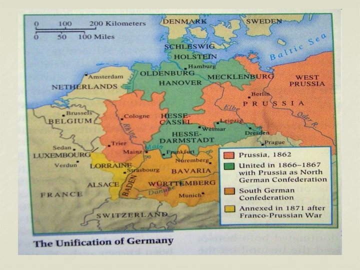 The Unification of Germany n n Germany was also divided into a bunch of small states, the largest and most powerful of which was Prussia. It was able to gain strength through industrializing faster than other countries. 1851 – the Zollverein (customs union) joined several states to Prussia. 1866 – winning a war against Austria gave Prussia control of more German-speaking territory 1871 – winning a war against France gave Germany control over Alsace and Lorraine (and helped create a disagreement that helped lead to World War I)