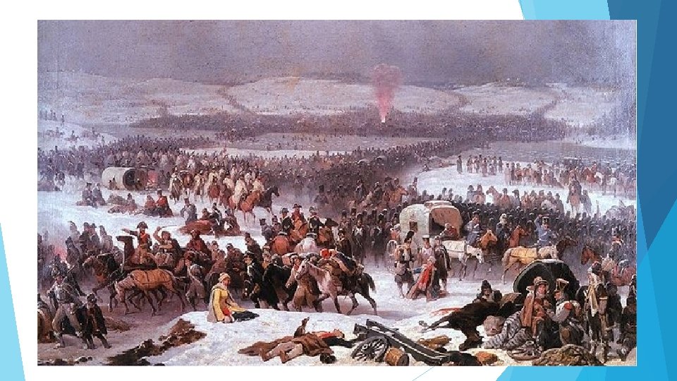 Russia – The Ultimate demise and the 100 days In 1810, Russia withdrew from the Continental System. In retaliation, Napoleon led a massive army into Russia in the summer of 1812. Rather than engaging the French in a full-scale battle, the Russians adopted a strategy of retreating whenever Napoleon’s forces attempted to attack. As a result, Napoleon’s troops trekked deeper into Russia despite being illprepared for an extended campaign. In September, both sides suffered heavy casualties in the indecisive Battle of Borodino. Napoleon’s forces marched on to Moscow, only to discover almost the entire population evacuated. Retreating Russians set fires across the city in an effort to deprive enemy troops of supplies. After waiting a month for a surrender that never came, Napoleon, faced with the onset of the Russian winter, was forced to order his starving, exhausted army out of Moscow. During the disastrous retreat, his army suffered continual harassment from a suddenly aggressive and merciless Russian army. Of Napoleon’s 600, 000 troops who began the campaign, only an estimated 100, 000 made it out of Russia.