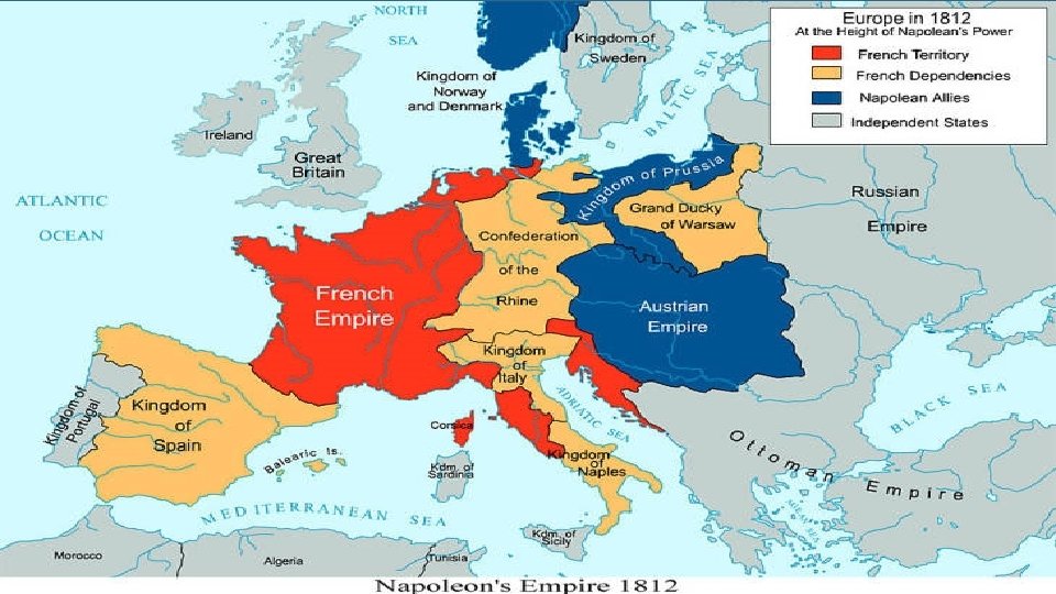 Grand Empire • Beginning in 1805, Napoleon engaged in constant warfare. • Eventually, Napoleon achieved the largest empire since Roman times (although it was only temporary). • • France extended to the Rhine, including Belgium and Holland, the German coast to the western Baltic, and the Italian coast extending down to Rome. Dependent satellite kingdoms: where Napoleon took leadership or placed his appointees on the throne • Holland, Spain, Westphalia, Venice, Naples, Papal States, Warsaw, The Rhine, Trieste and the Dalmatian coast • • Independent but allied states included: Austria, Prussia and Russia. • All countries of the Grand Empire saw the introduction of some of the main principles of the French Revolution. • Notable exception: no self-gov’t through elected legislative bodies.