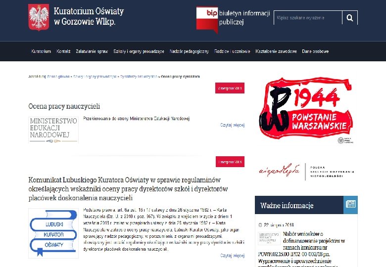 Program Lubuskiego Kuratora Oświaty Wstęp Po dokonaniu analizy wyników egzaminów zewnętrznych w roku szkolnym 2017/2018 i wniosków z nadzoru pedagogicznego Lubuskiego Kuratora Oświaty stwierdzono potrzebę wzmocnienia nadzoru pedagogicznego nad realizacją podstawy programowej w szkołach podstawowych, ukierunkowanego na efektywność procesu kształcenia. Podstawa prawna Art. 51 ust. 1; art. 44 ust. 1, 2 ustawy z dnia 14 grudnia 2016, Prawo oświatowe (tekst jednolity: Dz. U. z 2018 r. poz. 996 z późn. zm. ). Cel główny: rozwijanie kompetencji i wspomaganie dyrektorów szkół w zakresie sprawowania nadzoru pedagogicznego nad procesem edukacyjnym planowanym i realizowanym w sposób sprzyjający rozwojowi uczniów, w tym dobrze przygotowującym ich do egzaminu ósmoklasisty.