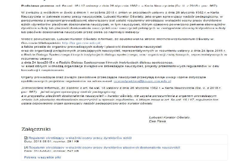 Komunikaty Procedura wyrażania zgody na zatrudnienie w szkołach osób niebędących nauczycielami oraz nauczycieli nieposiadających wymaganych kwalifikacji Wniosek o wyrażenie zgody na zatrudnienie nauczyciela nieposiadającego wymaganych kwalifikacji lub o wyrażenie zgody na zatrudnienie osoby niebędącej nauczycielem powinien być wydrukiem wypełnionego formularza on-line umieszczonego pod adresem http: //zatrudnienie. ko-gorzow. edu. pl, opatrzonym stosownymi pieczęciami oraz podpisem dyrektora szkoły. Wniosek powinien zostać przesłany do Kuratorium Oświaty w Gorzowie Wielkopolskim. Do wniosku należy załączyć wskazane w procedurze dokumenty. Procedura jest udostępniona na stronie Kuratorium Oświaty w Gorzowie Wlkp. w zakładce: Szkoły i organy prowadzące » Dyrektorzy i nauczyciele » Zgody na zatrudnienie 141