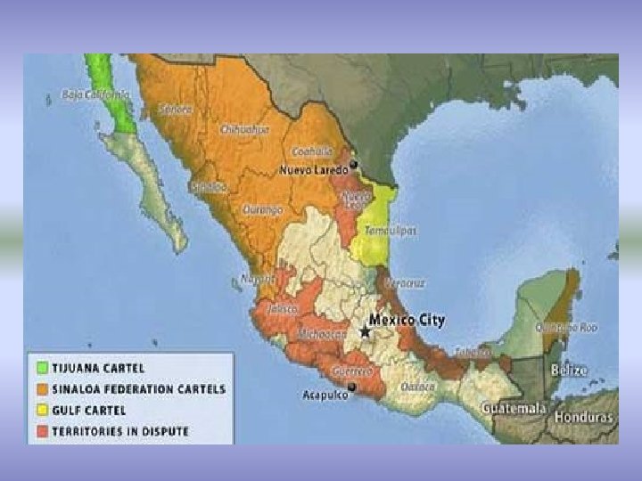 Carteles La Procuraduría General de la República (PGR) numera siete cárteles operando dentro del territorio mexicano: el cártel de Juárez (Carrillo Fuentes), el cártel del Golfo (Osiel Cárdenas), el cártel de Tijuana (Arellano Félix), el cártel de Colima (Amézcua Contreras), el cártel de Sinaloa (Palma-Guzmán Loera), el cártel Milenio (Valencia) y el cártel de Oaxaca (Díaz Parada). Con el fin de aumentar su capacidad de producción y distribución de narcóticos, el Cártel de Tijuana ha establecido una relación de cooperación y colaboración con el Cártel del Golfo, aunque continúan funcionando como organizaciones criminales independientes. El Cártel de Juárez es la organización con mayor presencia en México. Mantiene su área de influencia en 21 entidades. El Cártel de Colima es considerado una de las mayores organizaciones dedicadas a la producción y distribución de drogas sintéticas, se les refiere como los “Reyes de las Metanfetaminas”.