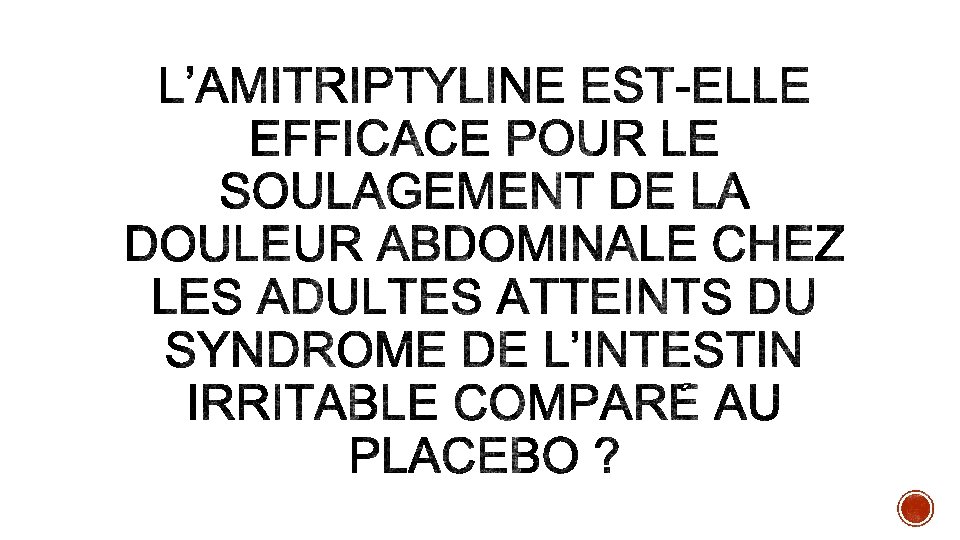 § Peu d’études démontrent clairement un efficacité de l’Amitrityline dans l’amélioration de la douleur abdominale dans le SII comparé au placebo. § Quelques résultats significatifs qui démontrent une amélioration § Amitriptyline à garder en tête pour patients réfractaires § Peu d’effets secondaires § Essai thérapeutique à faible dose § Encore du travail à faire !! § Comprendre le mécanisme derrière le SII pour mieux cibler le traitement § Amitriptyline en 1 ere ligne ? ?
