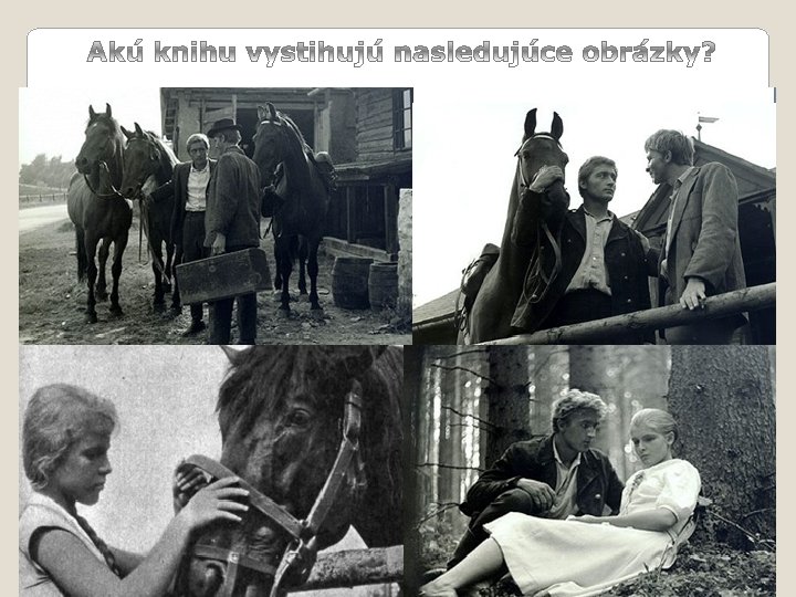rozprávač príbehu - Peter miesto deja – Leštiny (Orava) kôň - symbol spravodlivosti (udupe zlého Zápotočného) 3 x kone – symbol, ktorý predstavuje lásku troch mužov jednej žene (ich nádeje sú jednaké – rovnaká farba koní) Vzťah Petra a Jana ku koňom – Peter má kone rád, Jano je tyran k