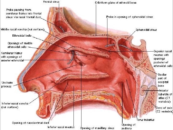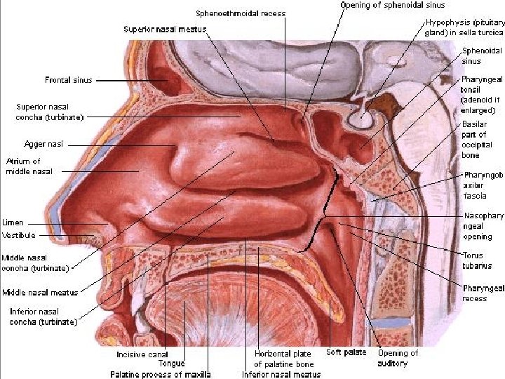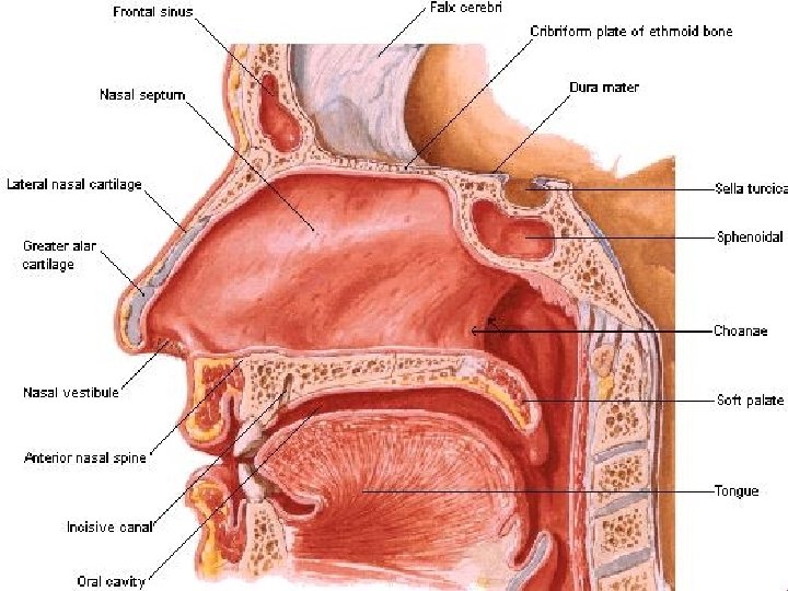 Nasal Cavity Ø The nasal cavity extends from the nostrils in front to the posterior nasal apertures or choanae behind Ø This is where the nose opens into the nasopharynx Ø The nasal vestibule is the area of the nasal cavity lying just inside the nostril