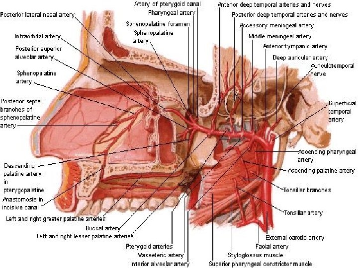 Blood Supply Ø The arterial supply to the nasal cavity is from branches of the maxillary artery, one of the terminal branches of the external carotid artery Ø The most important branch is the sphenopalatine artery Ø The sphenopalatine artery anastomoses with the septal branch of the superior labial branch of the facial artery in the region of the vestibule Ø The submucous venous plexus is drained by veins that accompany the arteries