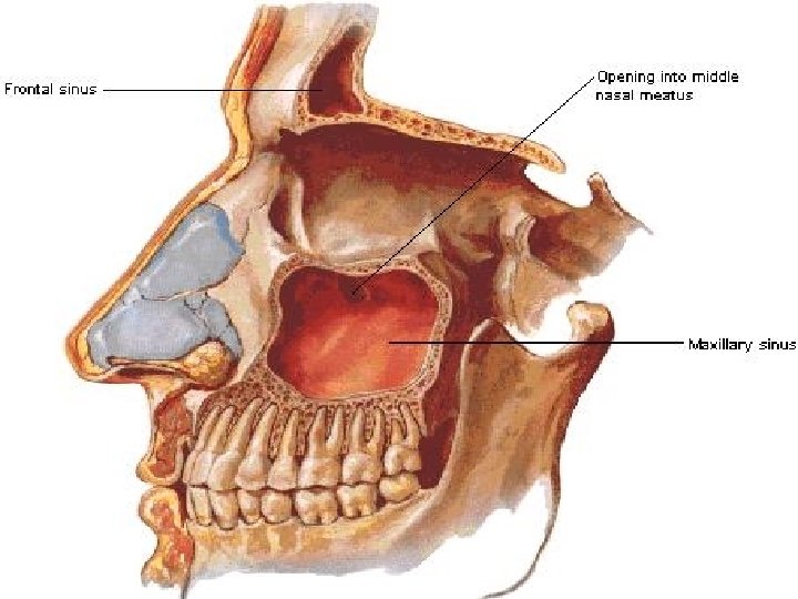 Maxillary Sinus Ø The maxillary sinus is pyramidal in shape and located within the body of the maxilla behind the skin of the cheek Ø The roof is formed by the floor of the orbit, and the floor is related to the roots of the premolars and molar teeth Ø The maxillary sinus opens into the middle meatus of the nose through the hiatus semilunaris