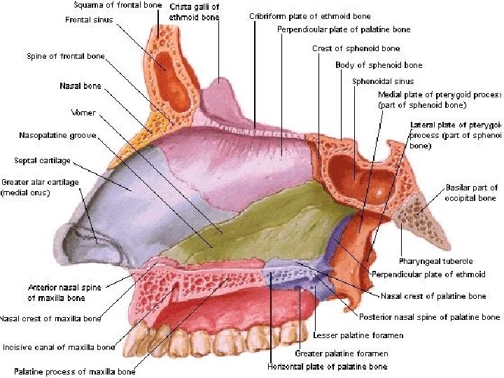 Walls of the Nasal Cavity Ø Each half of the nasal cavity has a floor, a roof, a lateral wall, and a medial or septal wall Ø The floor is formed by palatine process of the maxilla and the horizontal plate of the palatine bone Ø The roof is narrow and is formed anteriorly beneath the bridge of the nose by the nasal and frontal bones Ø In the middle by the cribriform plate of the ethmoid, located beneath the anterior cranial fossa
