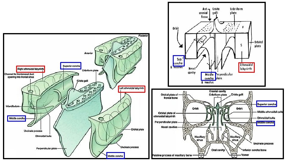 Conchae v. These are curved bony projections lined by mucosa, directed downwards and medially. v 3 in number: • Superior Nasal Concha. • Middle Nasal Concha. • Inferior Nasal Concha. v. Superior and middle nasal conchae are projections from medial surface of ethmoidal labyrinth. v. Inferior nasal concha is an independent bone. v. Superior concha is smallest and Inferior concha is largest in size.
