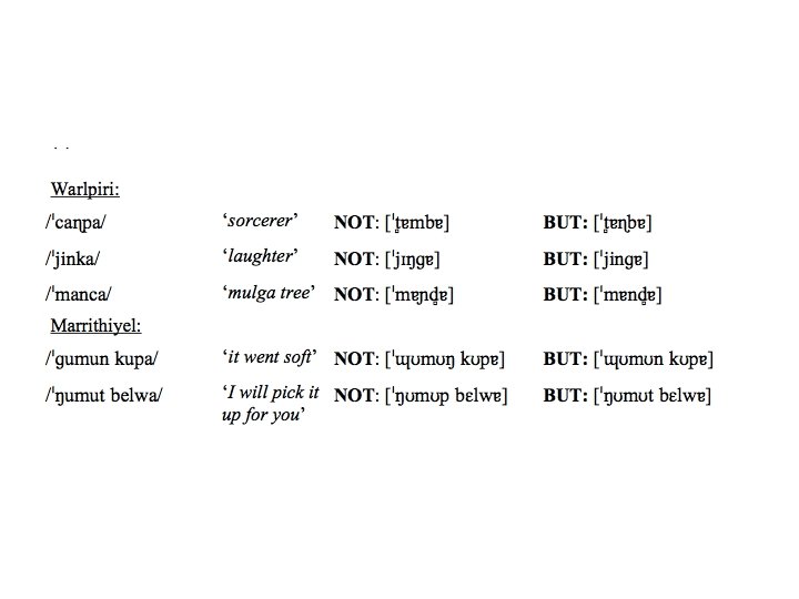 /cinaka/ = ‘innen’ in Gupapujngu Der relativ späte und abrupte Ansatz der Nasalisierung kann einen kurzen Oralverschluss zur Folge haben ‐also ‐‐ [dn] statt [n] daher phonetisch [cidnaka].