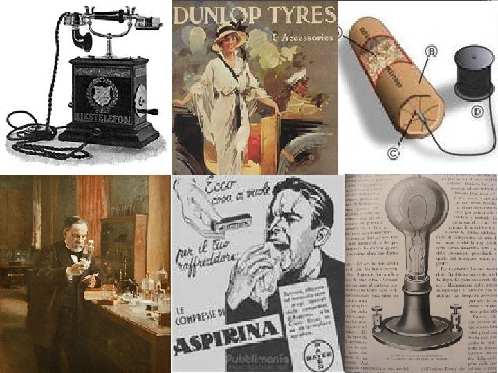 Progressi tecnico-scientifici 1854 Barsanti e Matteucci inventano il motore a scoppio 1859 prime estrazioni di petrolio negli USA 1864 procedimento Siemens-Martin per l’acciaio 1866 Alfred B. Nobel inventa la dinamite, perfezionata nel 1875 1871 Meucci brevetta il telefono; poi anche A. G. Bell nel 1876 1885 Louis Pasteur effettua la prima vaccinazione antirabbica 1887 scoperte di Hertz sulle onde elettromagnetiche 1888 John B. Dunlop brevetta il primo pneumatico 1893 la Bayer produce l’aspirina 1895 Marconi fa la prima trasmissione di segnali radio; i fratelli Lumière inventano il cinematografo; 1898 i coniugi Curie scoprono il radio