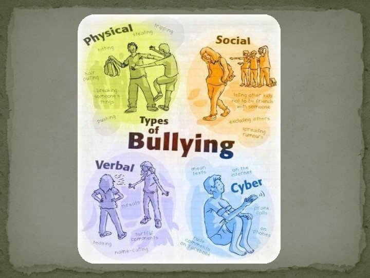 Vrste nasilje u školi: 1. FIZIČKO (naguravanja, udaranja, grebanja i sl. ) 2. VERBALNO (nazivanje pogrdnim imenima, prijetnje i sl. ) 3. SOCIJALNO (ogovaranje, ignoriranje i pokušaji da se drugu osobu izbaci iz skupine…) 4. PSIHOLOŠKI (prijeteći pogledi, dovođenje u neugodnost i sl. )