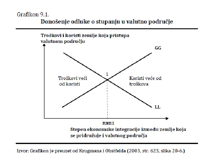 • Prema grafikonu 9. 1. , zemlja će doneti odluku da fiksira kurs svoje valute ukoliko je stepen njene ekonomske integracije sa zemljama valutnog područja najmanje u tački označenoj kao KNEI (kritični nivo ekonomske integracije), a to je upravo u tački 1 koja se nalazi u preseku krivih GG i LL. • Ukoliko bi nivo njene integracije bio manji od KNEI, troškovi fiksiranja deviznog kursa bi bili veći od koristi, tako da bi za zemlju bilo bolje da odustane od vezivanja svoje valute za valutu posmatranog valutnog područja. • Međutim, ako je stepen integracije na nivou KNEI ili iznad toga, koristi od pristupanja valutnom području su veće od troškova žrtvovanja privredne stabilnosti, tako da je za zemlju bolje da fiksira kurs svoje valute u odnosu na valutu posmatranog područja.