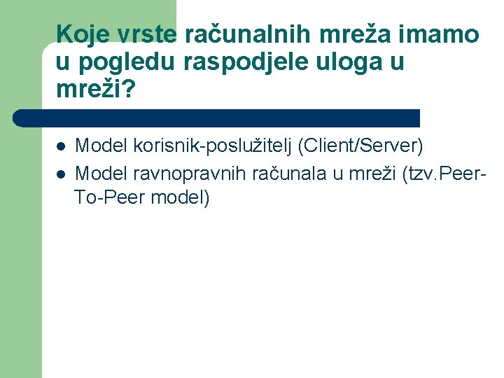 Koje vrste računalnih mreža imamo u pogledu raspodjele uloga u mreži? l l Model korisnik-poslužitelj (Client/Server) Model ravnopravnih računala u mreži (tzv. Peer. To-Peer model)