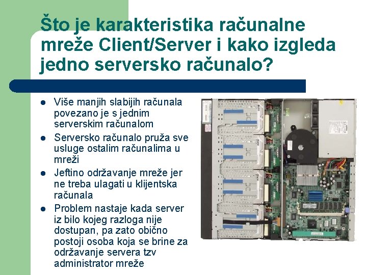 Što je karakteristika računalne mreže Client/Server i kako izgleda jedno serversko računalo? l l Više manjih slabijih računala povezano je s jednim serverskim računalom Serversko računalo pruža sve usluge ostalim računalima u mreži Jeftino održavanje mreže jer ne treba ulagati u klijentska računala Problem nastaje kada server iz bilo kojeg razloga nije dostupan, pa zato obično postoji osoba koja se brine za održavanje servera tzv administrator mreže