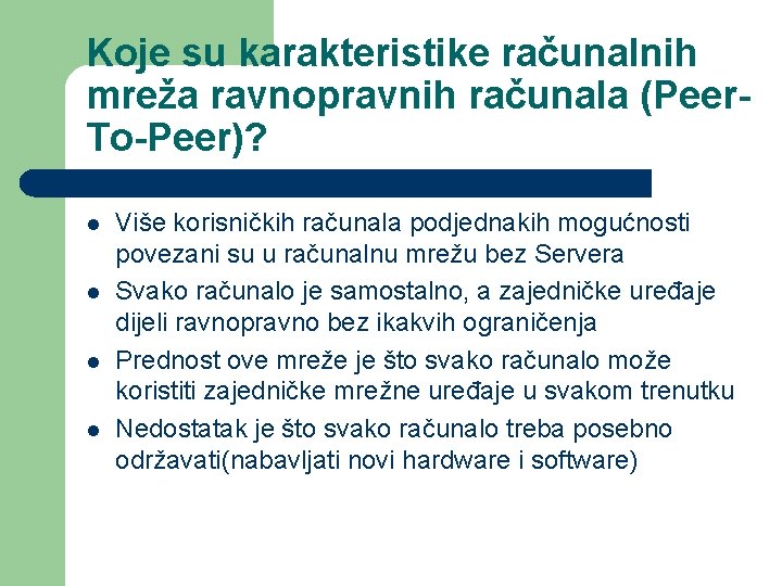 Koje su karakteristike računalnih mreža ravnopravnih računala (Peer. To-Peer)? l l Više korisničkih računala podjednakih mogućnosti povezani su u računalnu mrežu bez Servera Svako računalo je samostalno, a zajedničke uređaje dijeli ravnopravno bez ikakvih ograničenja Prednost ove mreže je što svako računalo može koristiti zajedničke mrežne uređaje u svakom trenutku Nedostatak je što svako računalo treba posebno održavati(nabavljati novi hardware i software)