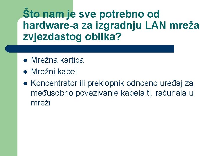 Što nam je sve potrebno od hardware-a za izgradnju LAN mreža zvjezdastog oblika? l l l Mrežna kartica Mrežni kabel Koncentrator ili preklopnik odnosno uređaj za međusobno povezivanje kabela tj. računala u mreži