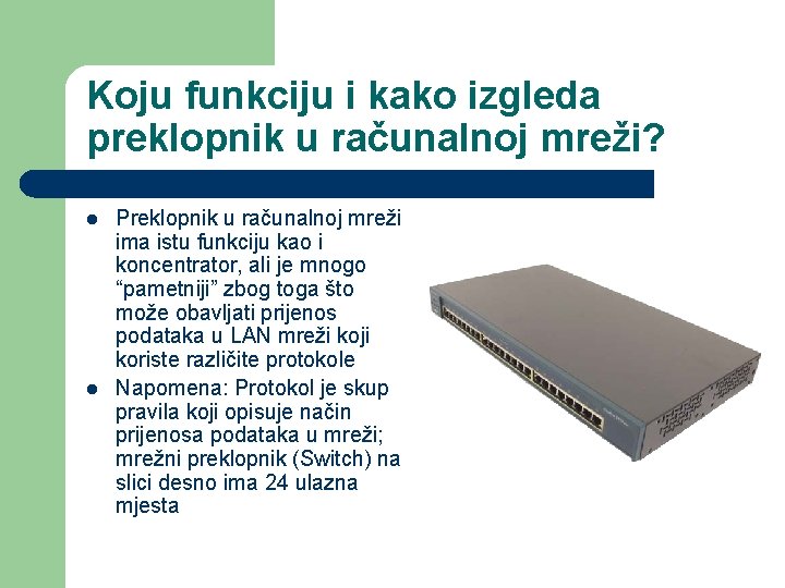 Koju funkciju i kako izgleda preklopnik u računalnoj mreži? l l Preklopnik u računalnoj mreži ima istu funkciju kao i koncentrator, ali je mnogo “pametniji” zbog toga što može obavljati prijenos podataka u LAN mreži koji koriste različite protokole Napomena: Protokol je skup pravila koji opisuje način prijenosa podataka u mreži; mrežni preklopnik (Switch) na slici desno ima 24 ulazna mjesta