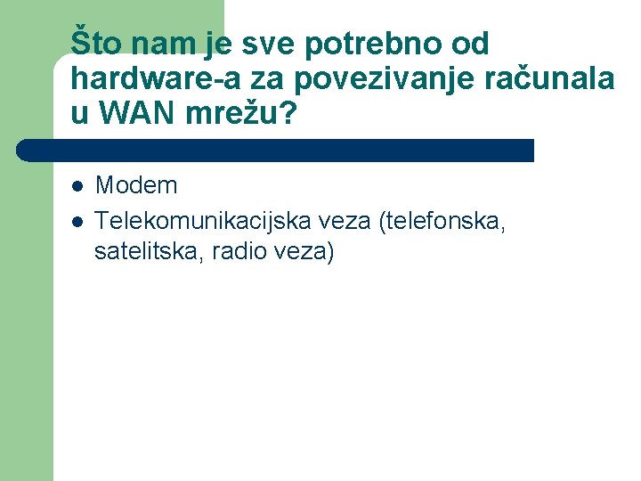 Što nam je sve potrebno od hardware-a za povezivanje računala u WAN mrežu? l l Modem Telekomunikacijska veza (telefonska, satelitska, radio veza)