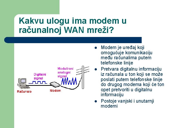 Kakvu ulogu ima modem u računalnoj WAN mreži? l l l Modem je uređaj koji omogućuje komunikaciju među računalima putem telefonske linije Pretvara digitalnu informaciju iz računala u ton koji se može poslati putem telefonske linije do drugog modema koji će ton opet pretvoriti u digitalnu informaciju Postoje vanjski i unutarnji modemi